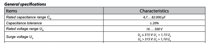 On voit qu’au-dessus de 315 V de tension de service la tension maximale sera de 1,1 x la tension de service (rated voltage range). Dans le cas d’un condensateur de 500 V, on peut donc « monter » à 550 V, ce qui laisse une marge raisonnable.